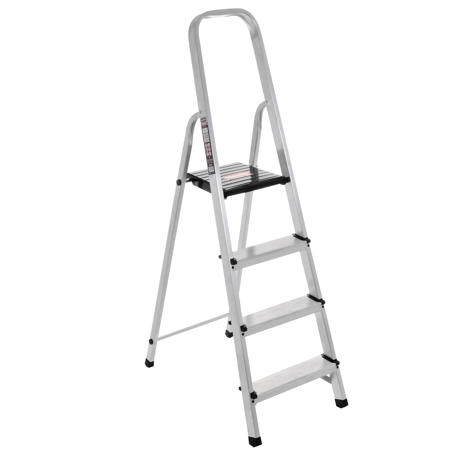 Multitrade Malta Ladders – GHHOBBY4 Step Ladder Durable and lightweight aluminum ladder designed for hobby and home use. Built with a high-strength 46×20 mm aluminum profile and 1.2 mm thickness, it features anti-slip striped steps for secure footing and a sturdy 25×25 cm landing platform with a lock system. Reinforced with metal base brackets and crossed aluminum supports for added stability, it also includes safety harness options for enhanced security. Manufactured in accordance with European standard EN131, it supports a maximum load of 150 kg and Ideal for safe and reliable everyday tasks.