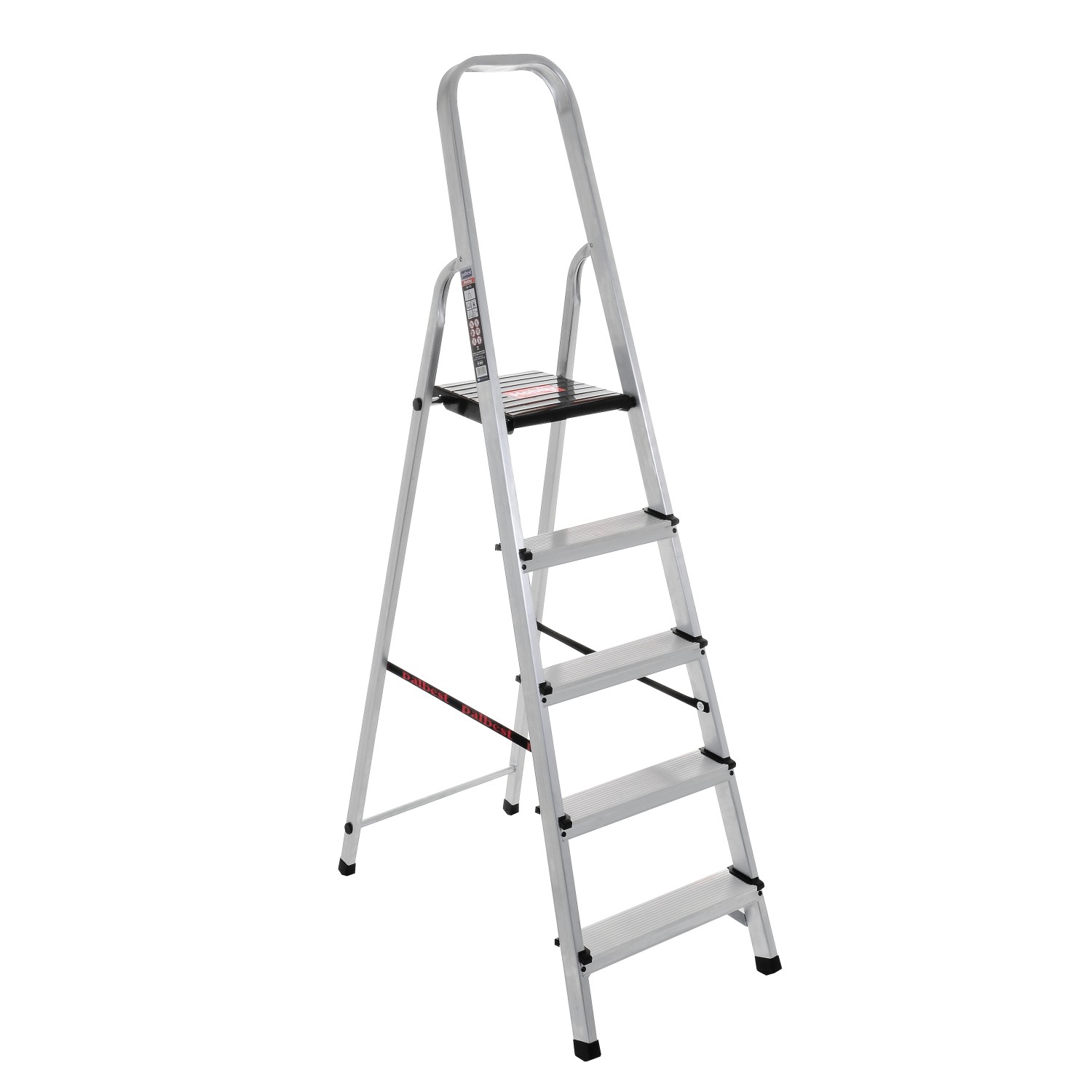 Multitrade Malta Ladders – GHHOBBY5 Step Ladder Durable and lightweight aluminum ladder designed for hobby and home use. Built with a high-strength 46×20 mm aluminum profile and 1.2 mm thickness, it features anti-slip striped steps for secure footing and a sturdy 25×25 cm landing platform with a lock system. Reinforced with metal base brackets and crossed aluminum supports for added stability, it also includes safety harness options for enhanced security. Manufactured in accordance with European standard EN131, it supports a maximum load of 150 kg and Ideal for safe and reliable everyday tasks.