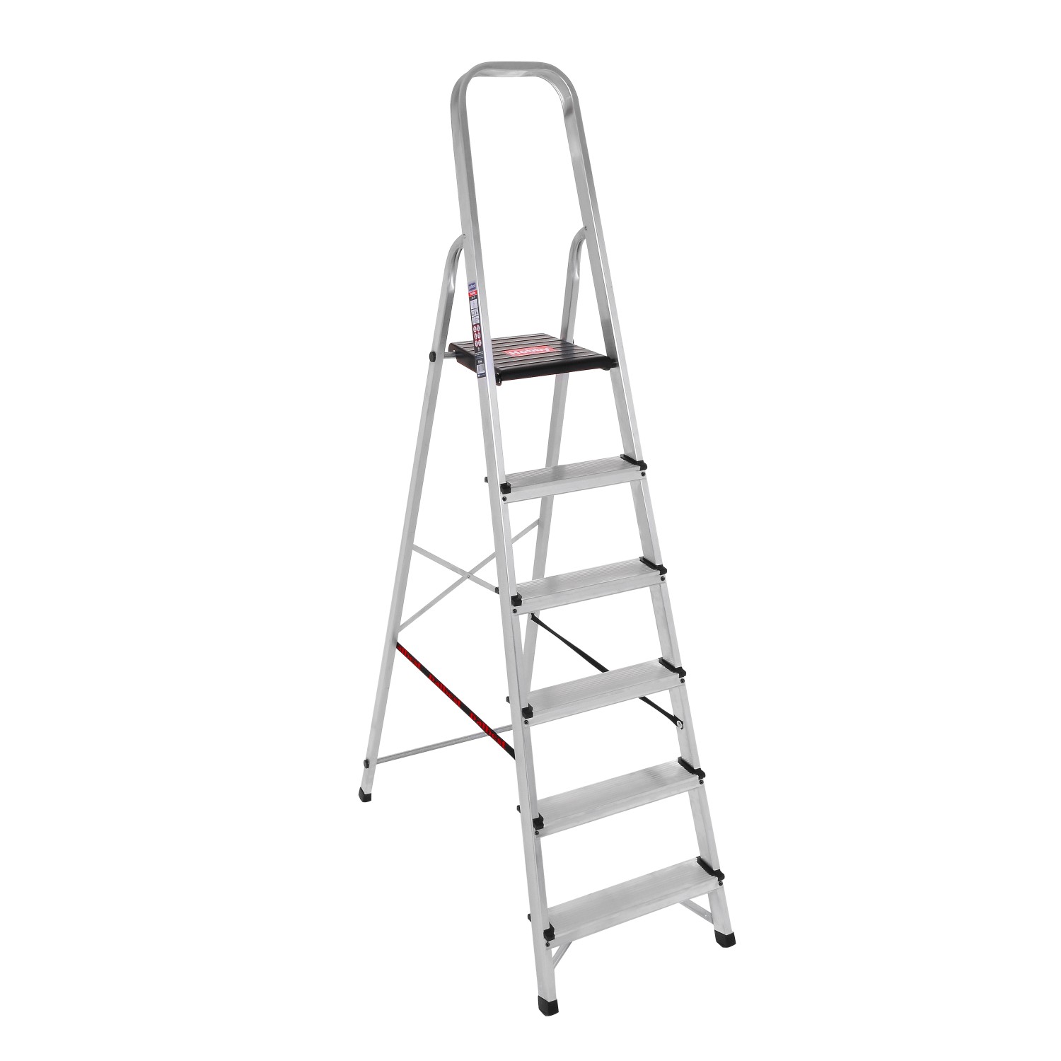 Multitrade Malta Ladders – GHHOBBY6 Step Ladder Durable and lightweight aluminum ladder designed for hobby and home use. Built with a high-strength 46×20 mm aluminum profile and 1.2 mm thickness, it features anti-slip striped steps for secure footing and a sturdy 25×25 cm landing platform with a lock system. Reinforced with metal base brackets and crossed aluminum supports for added stability, it also includes safety harness options for enhanced security. Manufactured in accordance with European standard EN131, it supports a maximum load of 150 kg and Ideal for safe and reliable everyday tasks.