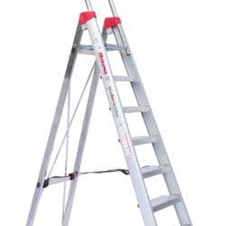 This is an ultra professional ‘A’ ladder. It has a very sturdy top step, and wide styles. These are tied and reinforced to it’s wide steps. A tool bag hangs on to the top rail. The rubber ends below the feet provide a good grip, and very well protect the floor beneath it. The Domus ladder is EN 131 certified. It not only satisfies these norms, but exceeds the given norm.