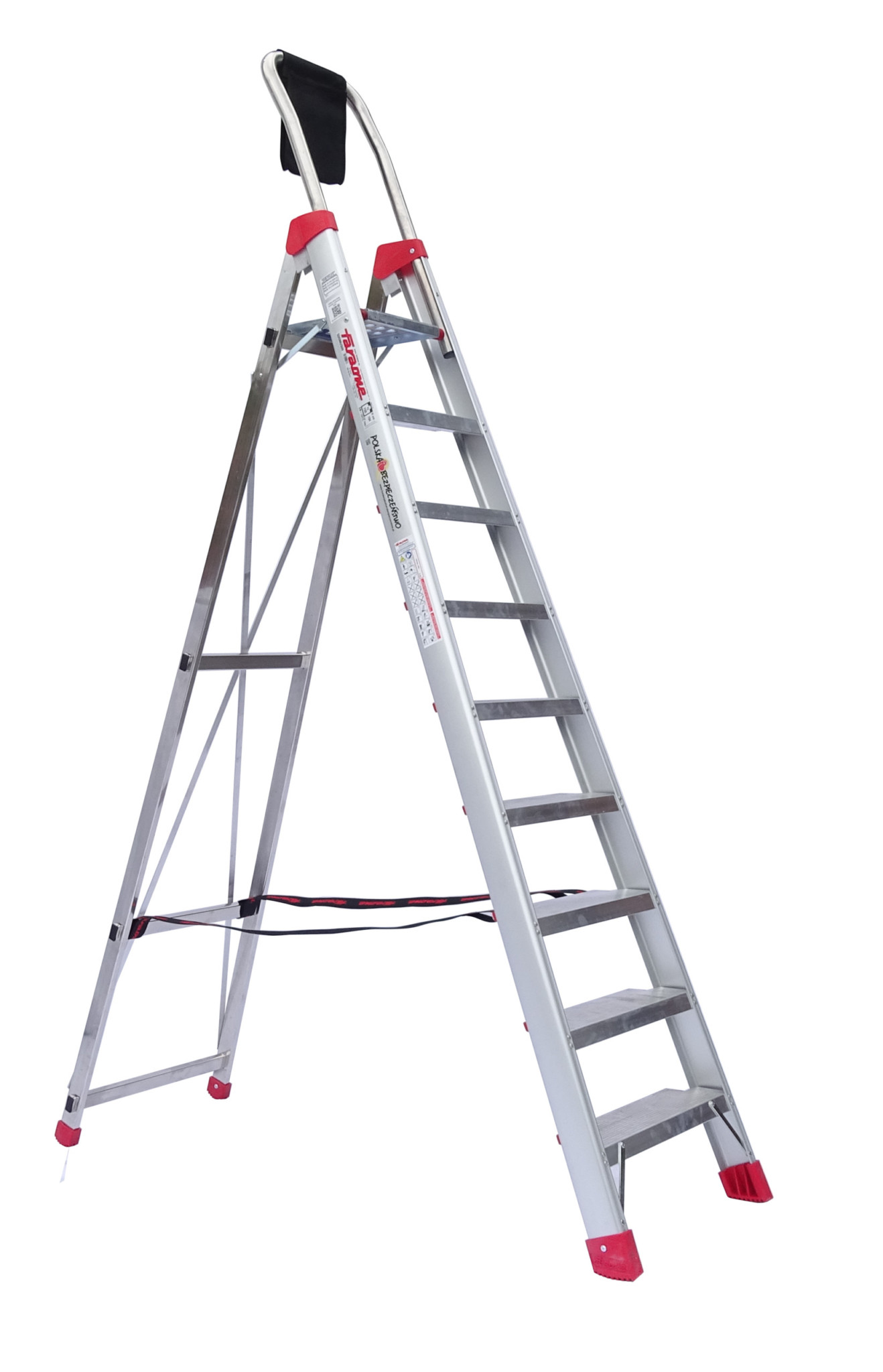 This is an ultra professional ‘A’ ladder. It has a very sturdy top step, and wide styles. These are tied and reinforced to it’s wide steps. A tool bag hangs on to the top rail. The rubber ends below the feet provide a good grip, and very well protect the floor beneath it. The Domus ladder is EN 131 certified. It not only satisfies these norms, but exceeds the given norm.