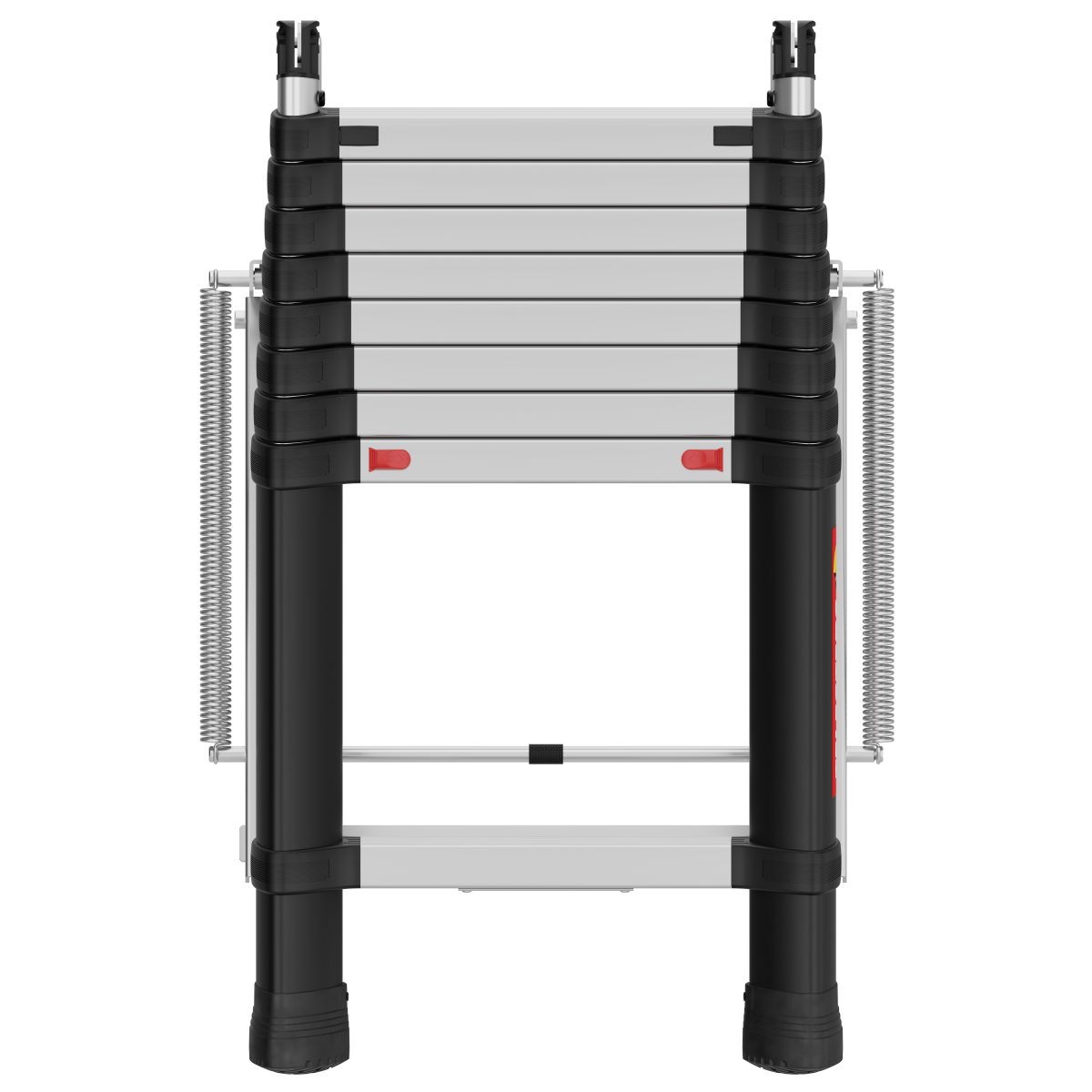 Simplicity and flexibility by all means, but we put safety first. The telescopic ladder is easily extended to the desired length, and securing the ladder before use is just as quick. When the red pins have folded out under every rung, this is the signal the ladder is ready for use and to withstand loads of up to 150 kg.