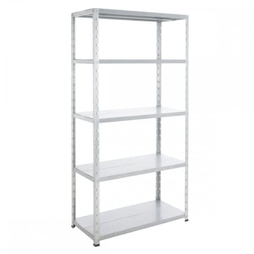 Zinc coated shelfing unit with 5 shelves, each shelf has a spread max carrying capacity of 70kg with a total shelfing capacity of 350kg
