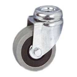 | Wheel description Rubber tread; polyamide centre with threadguards. Plain bearing bore The plain bearing bore results from a hole in the material forming the centre of the wheel and contains the axle. Axle Axle composed of ground steel bush with bolt and nut. Swivel bracket with bolt hole Swivel bracket with bolt hole. The plate, the ball rice ring and the fork are made of pressed steel zinc plated finish; swivel actions: double ball greased race, with dust protection granted by the particular plate configuration. The king pin is obtained by moulding and duly rivetted. |